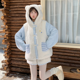 森女部落甜美风熊耳连帽马甲女2025新款 毛绒宽松显瘦拼色保暖外套
