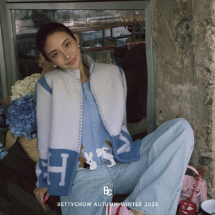 Bettychow H婴儿蓝羊毛手缝披肩外套复古时髦拼接高级感撞色夹克