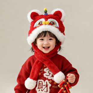 • 儿童红色醒狮冬季 毛绒一体帽男女宝宝保暖加厚防风新年喜庆毛绒帽