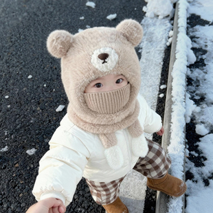 儿童帽子秋冬季 可爱小熊毛绒帽男童女童围巾一体套头帽保暖护耳帽