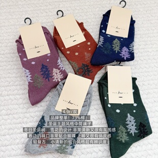 圣诞树雪花卷边复古中筒女式 73%精梳棉 品牌整单 袜子 包邮