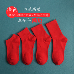 本命年红袜子男女中筒纯棉纯色船袜红色短袜情侣结婚喜庆新年长袜