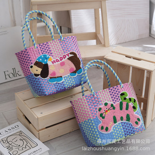 编织包腊肠狗刺绣可爱儿童大容量菜篮子糖果色春夏野餐郊游手提包