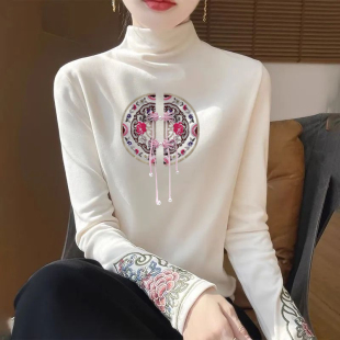T恤国风印花保暖上衣 中式 秋冬半高领德绒打底衫 女复古民族风长袖