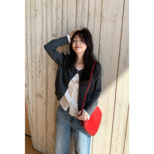 上衣女秋 开衫 一三良品小个子 温柔通勤木耳边拼接假两件针织衫