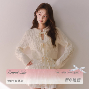 手工珍珠领短款 女冬季 毛衣外套 复古钩针系带蝴蝶结针织开衫 RECIT
