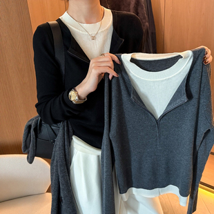 沫晗依美亨利领拼接撞色针织衫 假两件宽松叠穿内搭毛衣女 2025冬季