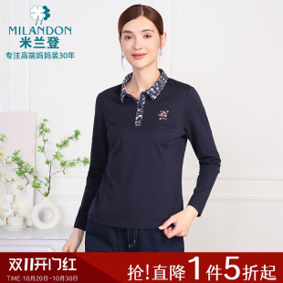 绣花翻领T恤女长袖 米兰登中老年妈妈装 时尚 新款 上衣潮 2025年秋季