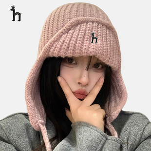 哈吉斯船长粉色针织毛线帽女秋冬护耳飞行帽百搭显脸小滑雪雷锋帽