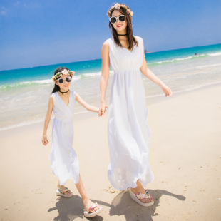 女童长裙仙 夏亲子装 母女装 海边度假沙滩裙白色雪纺连衣裙2019新款