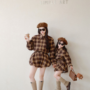 母女美式 新款 复古格子衬衫 秋季 女童衬衣灯笼裙 套装 2025超火亲子装
