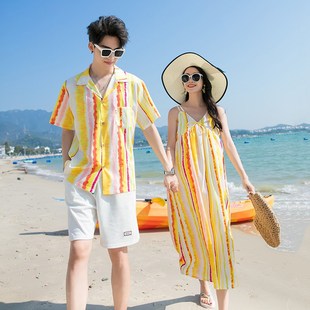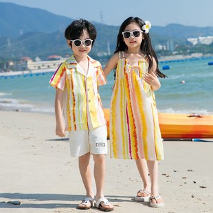 一家三口夏季 2024新款 衬衫 短袖 港风海边度假洋气母女连衣裙 亲子装