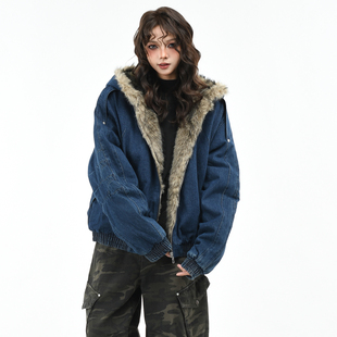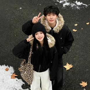 座山雕羊羔绒毛领连帽加绒棉服外套男女冬季 情侣棉袄 加厚棉衣短款
