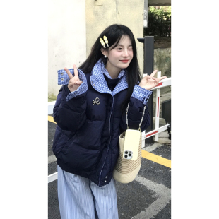 藏青色撞色格子假两件拼接棉服外套女冬季 棉衣面包服 宽松加厚美式