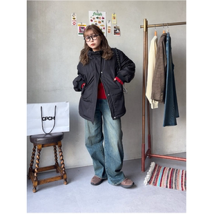 Amoeba原创美式 棉服女休闲学院风过膝加厚外套 翻毛领宽松中长款