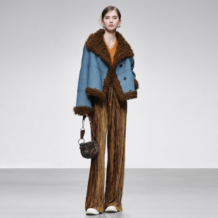 2025冬季 翻立领两面穿环保羊剪毛牛仔风短外套机车皮草大衣女