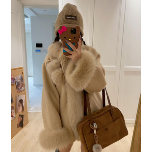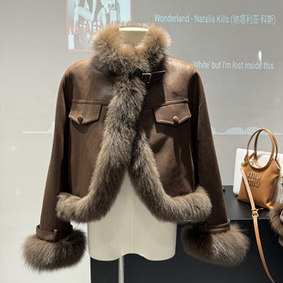 外套机车白鹅绒麂皮绒 狐狸毛皮草短款 焦糖奶茶 2025秋冬新款
