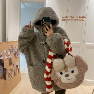 小考拉 宽松慵懒加厚羊羔毛皮毛一体牛角扣连帽皮草女冬毛毛外套