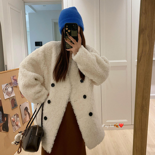 皮草女冬季 羊羔毛皮毛一体2025新款 毛毛外套 V领双排扣中长款 简约