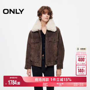 夹克外套女 正肩保暖羊毛领质感挺阔羊皮真皮短款 ONLY2025冬季 新款