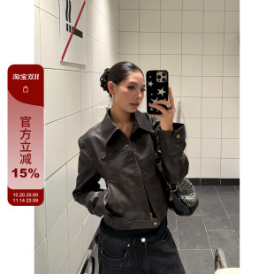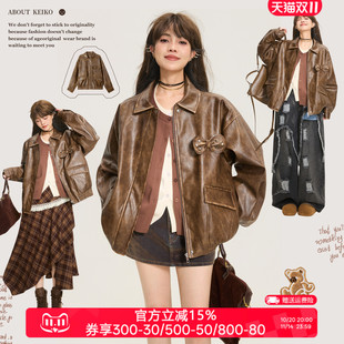 酷飒蝴蝶结饰廓形pu皮夹克 美式 KEIKO 巴恩风擦旧棕色皮衣外套新款