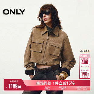 饰可拆卸领挺阔有型落肩宽松皮衣女 胸前兜盖装 ONLY2025冬季 新款