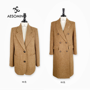 显瘦通勤西服上衣 女外套秋冬新款 艾薇诺伊中长款 人字纹毛呢小西装