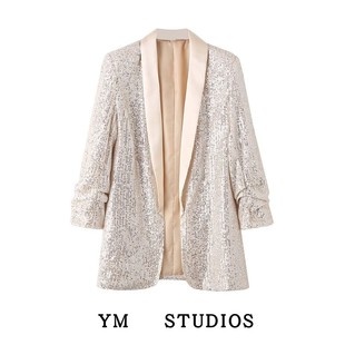 包邮 西装 美式 重工银色亮片西服ins风小众无扣褶皱开衫 潮 春款