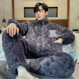 珊瑚绒三层加厚加绒夹棉保暖法兰绒家居服冬天套装 睡衣男士 秋冬季