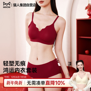 套装 猫人本命年小胸聚拢红色内衣新款 无痕显大结婚新娘文胸罩内裤