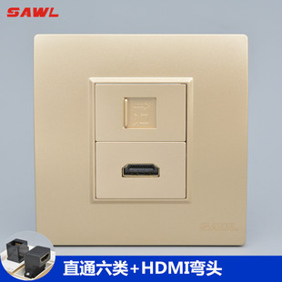 香槟色86型六类网络直通HDMI高清弯头直插面板电脑网线口电视墙插