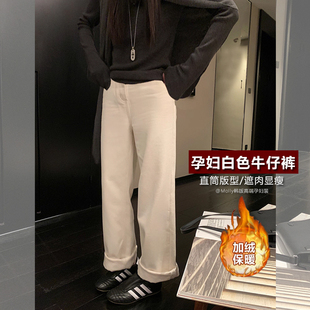 宽松休闲直筒阔腿拖地裤 孕妇白色加绒牛仔裤 秋冬外穿加绒加厚时尚