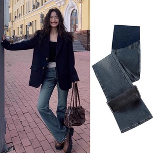 外穿孕期托腹弹力拖地裤 加绒2025新款 子 秋冬季 孕妇复古喇叭牛仔裤