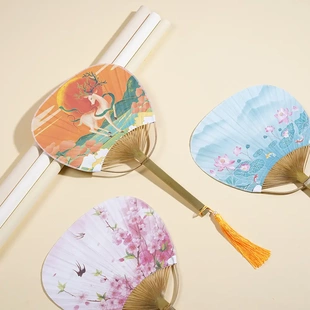 通用 纳凉古风圆形扇子 民俗 纸质竹丝印花团扇长柄扇舞蹈扇夏季
